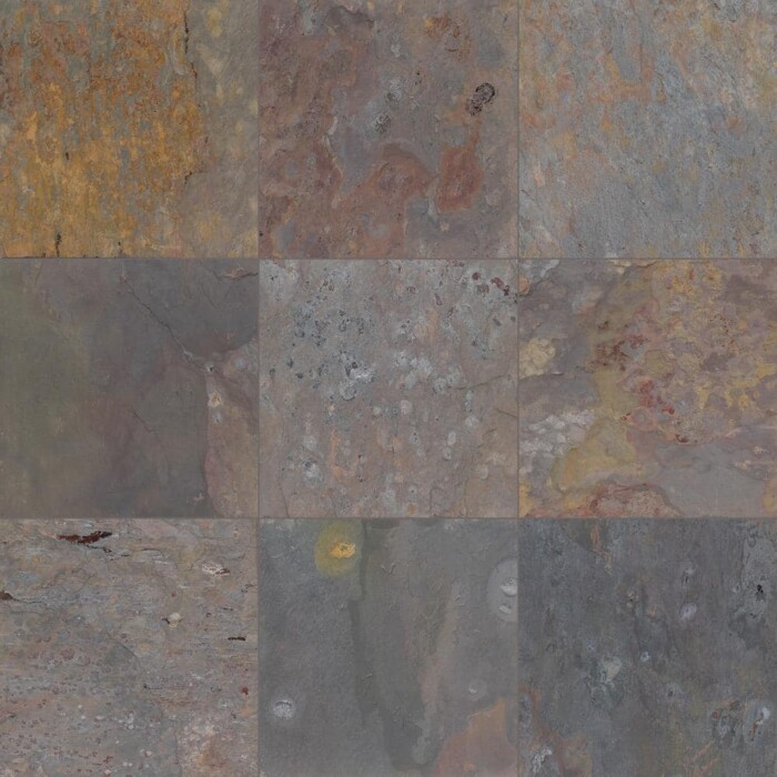 Kund Multi Slate is a hard, stable, and multicolored slate stone that is quarried in Haryana, India. It has a reddish brown base with rust and other markings that give it a unique, rustic charm. The stone can also have other tones, such as black, burgundy, gold, taupe, violet, and gray.
